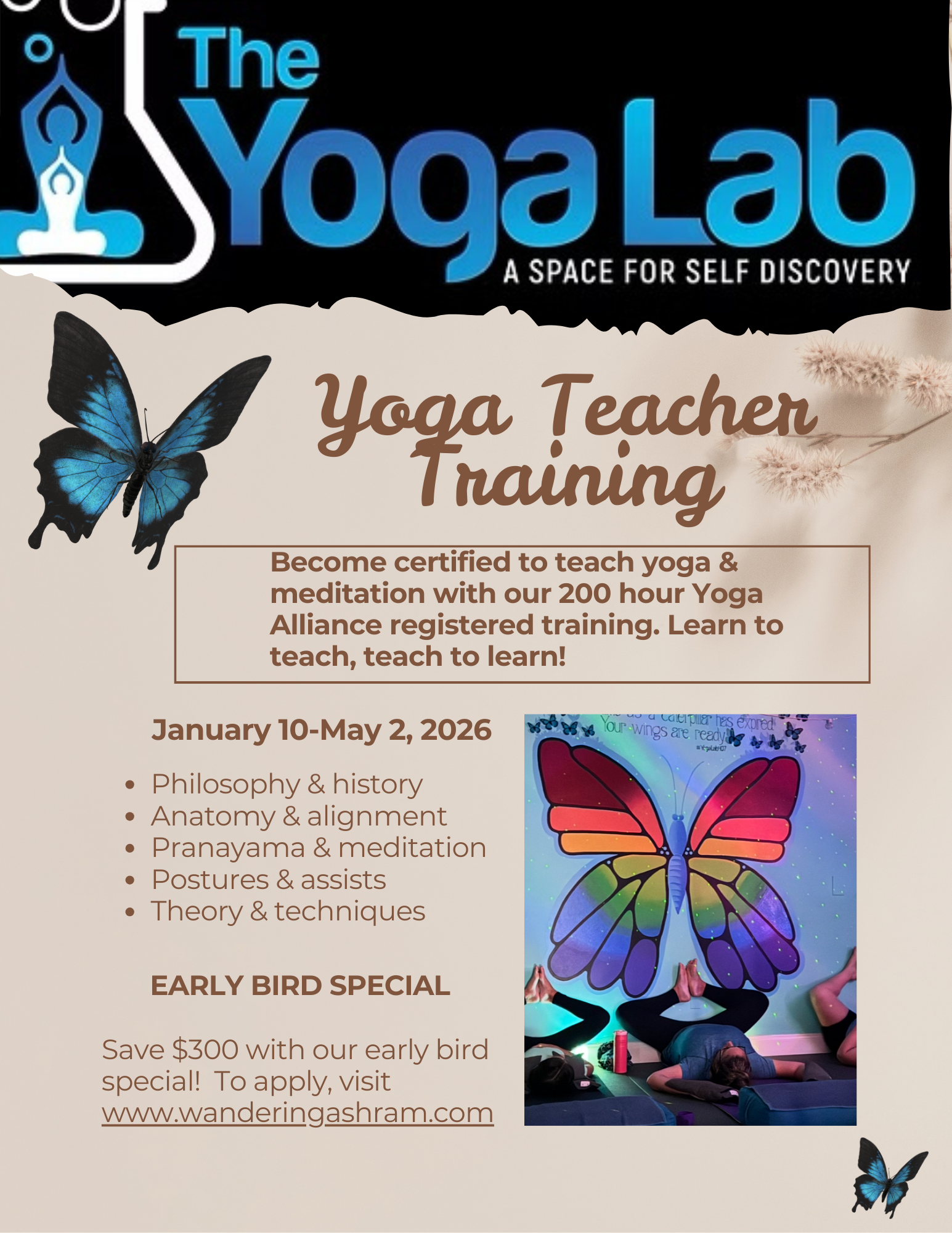 Wandering Ashram offers 200-hour, and 300-hour teacher training programs designed to meet students where they are, both physically and spiritually. With a curriculum that blends ancient wisdom with contemporary application, students gain the tools to teach with compassion, confidence, and authenticity. All offerings are grounded in a mindful, heart-centered approach, supporting personal growth and professional development.